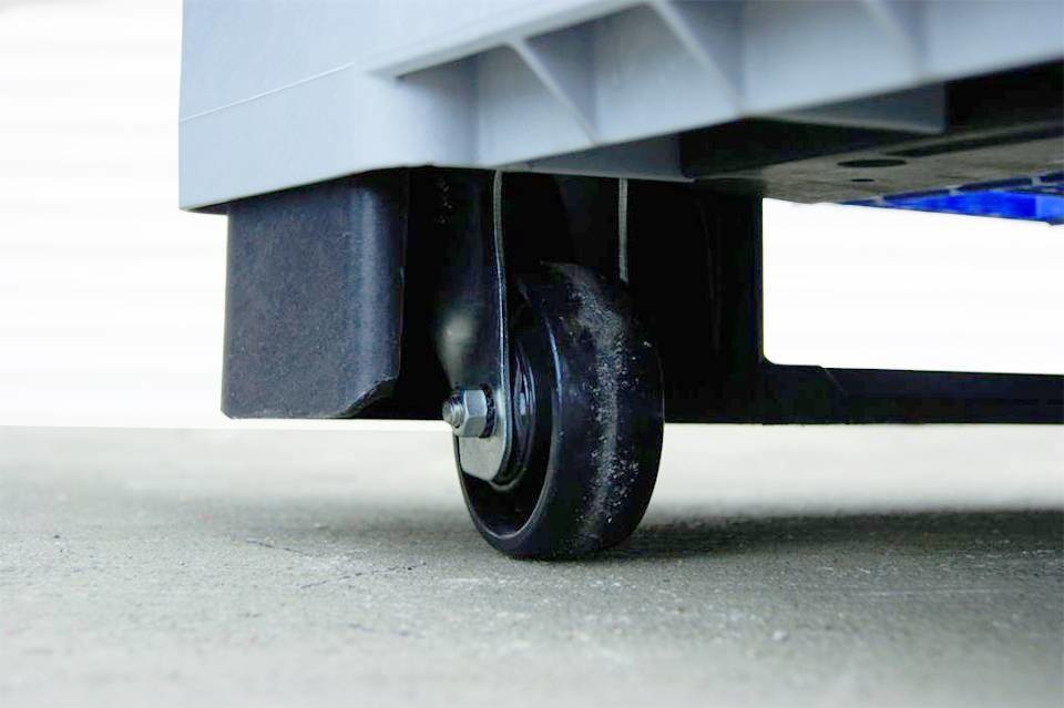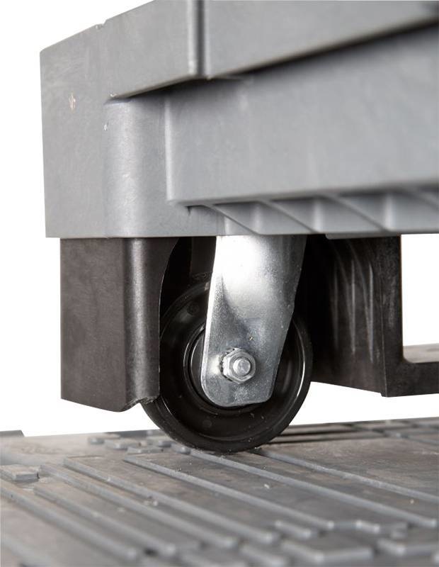 A palete de plástico é a combinação original entre uma palete Pally e um Dolly. O pedal permite transformar a palete de plástico num carrinho e vice-versa.